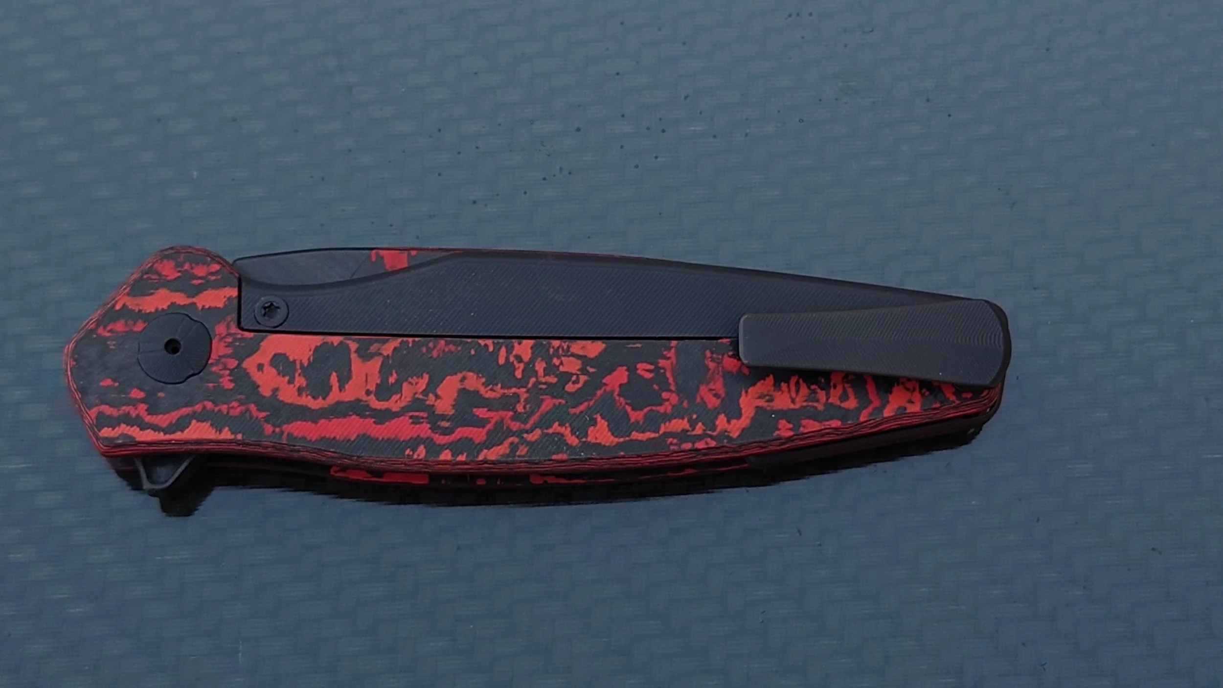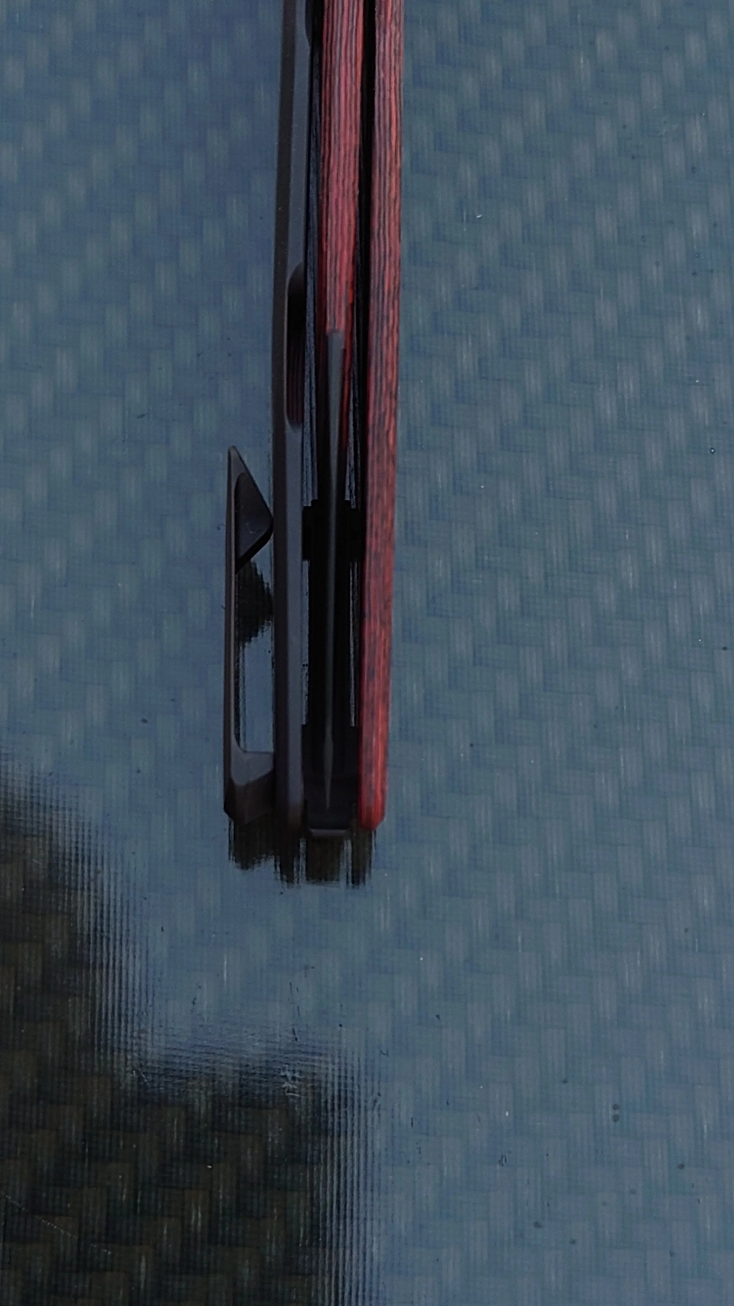 An ultralight weight, medium duty, flipper style folding pocket knife. Designed to be extremely light weight while still retaining full size (3.6” blade). With its carbon fiber bodied plain edge flat ground blade the entire knife weighs a mere 1.6 oz. The titanium hardware, handle scales and pocket clip are all 3d CNC machined, designed for comfort and ease of use. The action rides on fully ceramic custom bearings and snaps open incredibly fast using the flipper tab. It has a characteristic and satisfying double click opening action sound. The knife is mostly carbon fiber but uses a variation on the titanium integral frame lock design to keep the knife open against hardened steel inserts. Each piece is engraved with the model name and individual serial number on the backspacer. Each knife is machined, heat treated, hand finished, tested in house and proudly made in the USA.